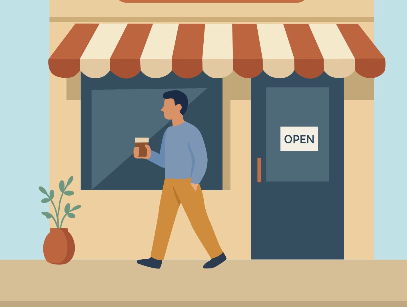 Small Business Saturday background vector illustration. Man walking with coffee in front of a local shop.